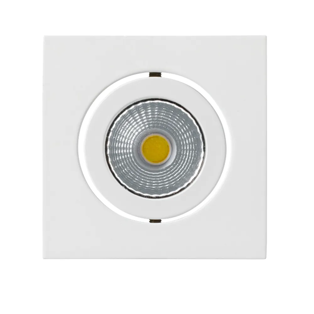Врезной квадратный мебельный светильник 5Вт, корпус белый алюминий. Цвет ДНЕВНОЙ БЕЛЫЙ 4000K. Светодиод 1х5W Bridgelux. CRI>80, Св.поток 350-400лм, наклоняемая ось, угол 25°. Питание 180-240VAC, 5Вт, 400mA 11-13V, драйвер в комплекте. Размеры 50x50x50 мм, врезное отверстие d42 мм.
