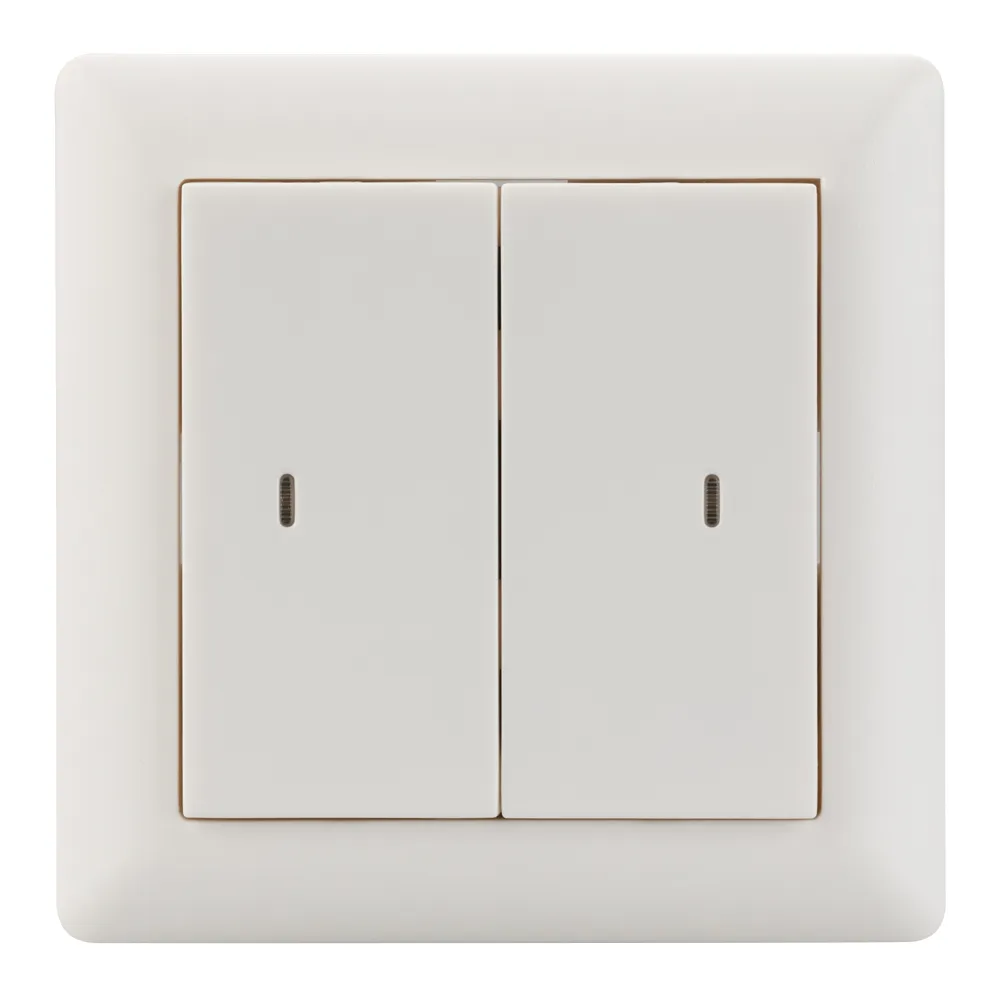 Универсальная двухклавишная встраиваемая настенная панель стандарта KNX с четырьмя кнопками. Цвет корпуса белый. Питание от шины KNX DC 21-30V. Размер 86х86х45 мм.