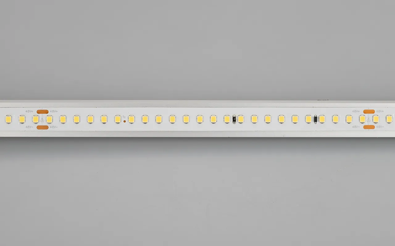 Стабилизированная лента LUX, подключение 50м в одну линию, светодиоды smd 2835, 144шт/м (7200шт на 50м), белая плата 12мм, скотч 3М. Цвет ДНЕВНОЙ 3800-4200K. Питание 48V, мощность 5.8 Вт/м (290 Вт на 50м), угол 120°, цветопередача CRI>85. Размеры 50000х12x1.6мм. Мин.отрезок 166.67мм, 24 шт светодиодов. Пакет 50м. Цена за 1м.