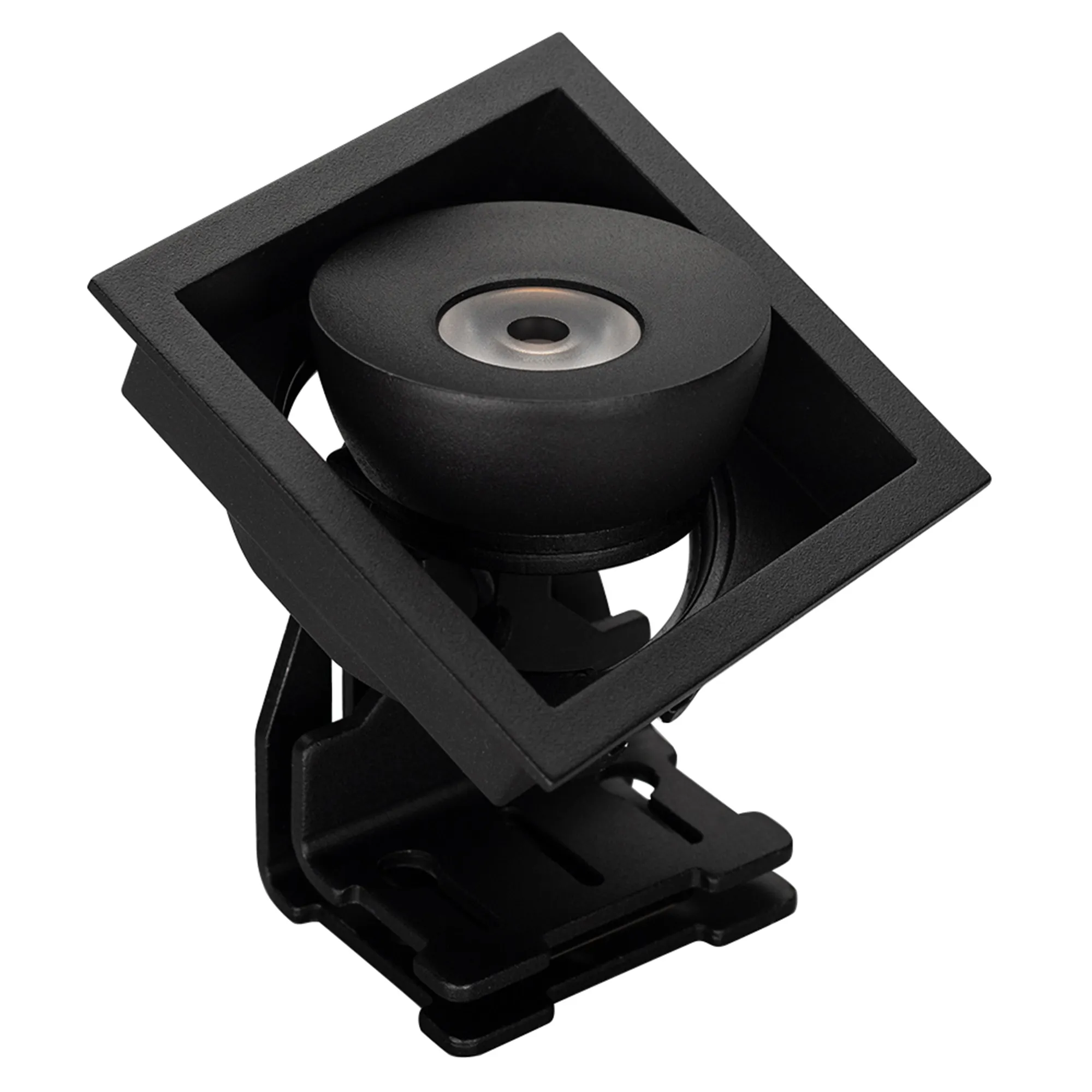 Встраиваемый поворотный светильник для потолка. Мощность 9W, цвет ДНЕВНОЙ 4000K, св.поток 630лм, угол 45°, RA>90. Корпус квадратный черный. Питание AC230V. Размеры LxWxH 80x80x90мм. Установка в отверстие 70x70мм. Драйвер в комплекте (30-45V, 220mA).