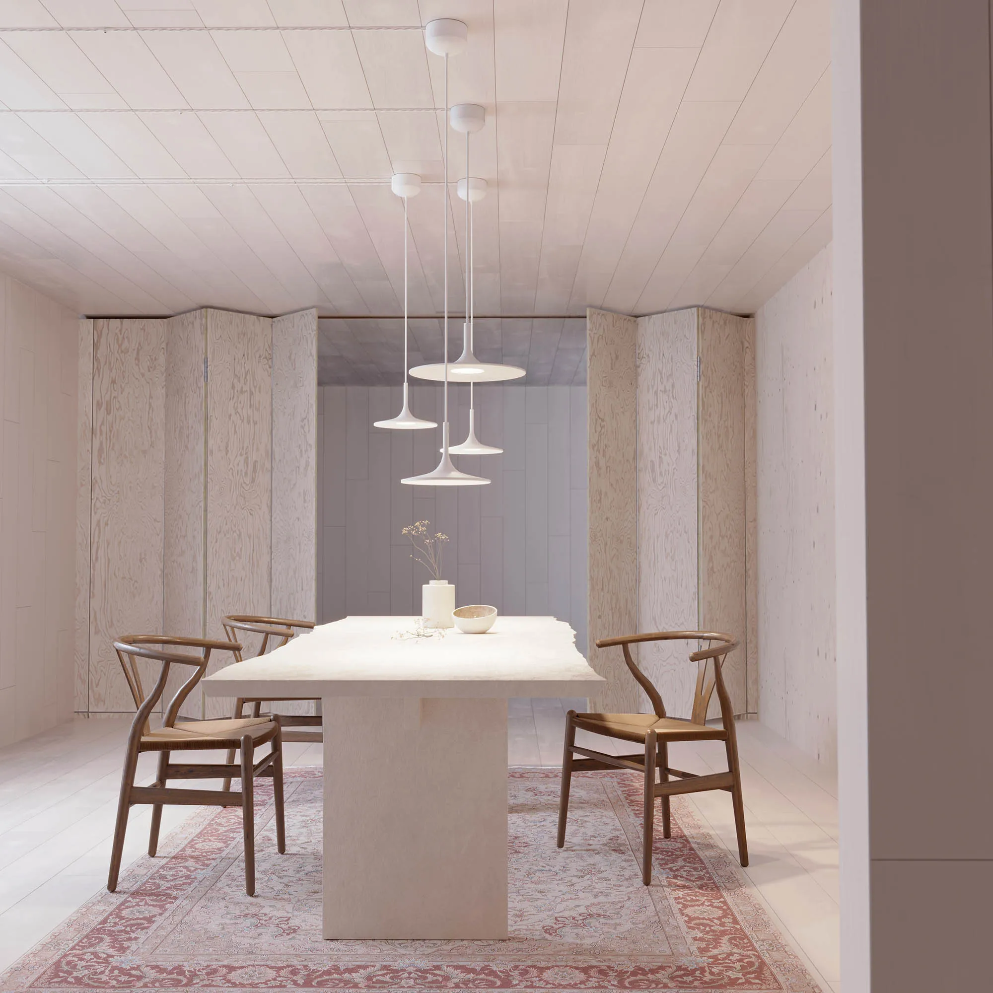 Подвесной светильник. Мощность 8 Вт, св. поток 525 лм, 70 лм/Вт, теплый 3000 K, CRI>90, угол 120°, напряжение питания 230 В. Белый круглый корпус из алюминия, рассеиватель каленое матовое стекло , степень защиты IP20. Размер: диаметр 250 мм, высота основания 64 мм, общая высота 108 мм. Монтаж подвесной, длина подвеса 1500 мм, регулируемая. Габариты чаши Ø120x75 мм. Драйвер 14-24 В, 300 мА, пульсация <5%.