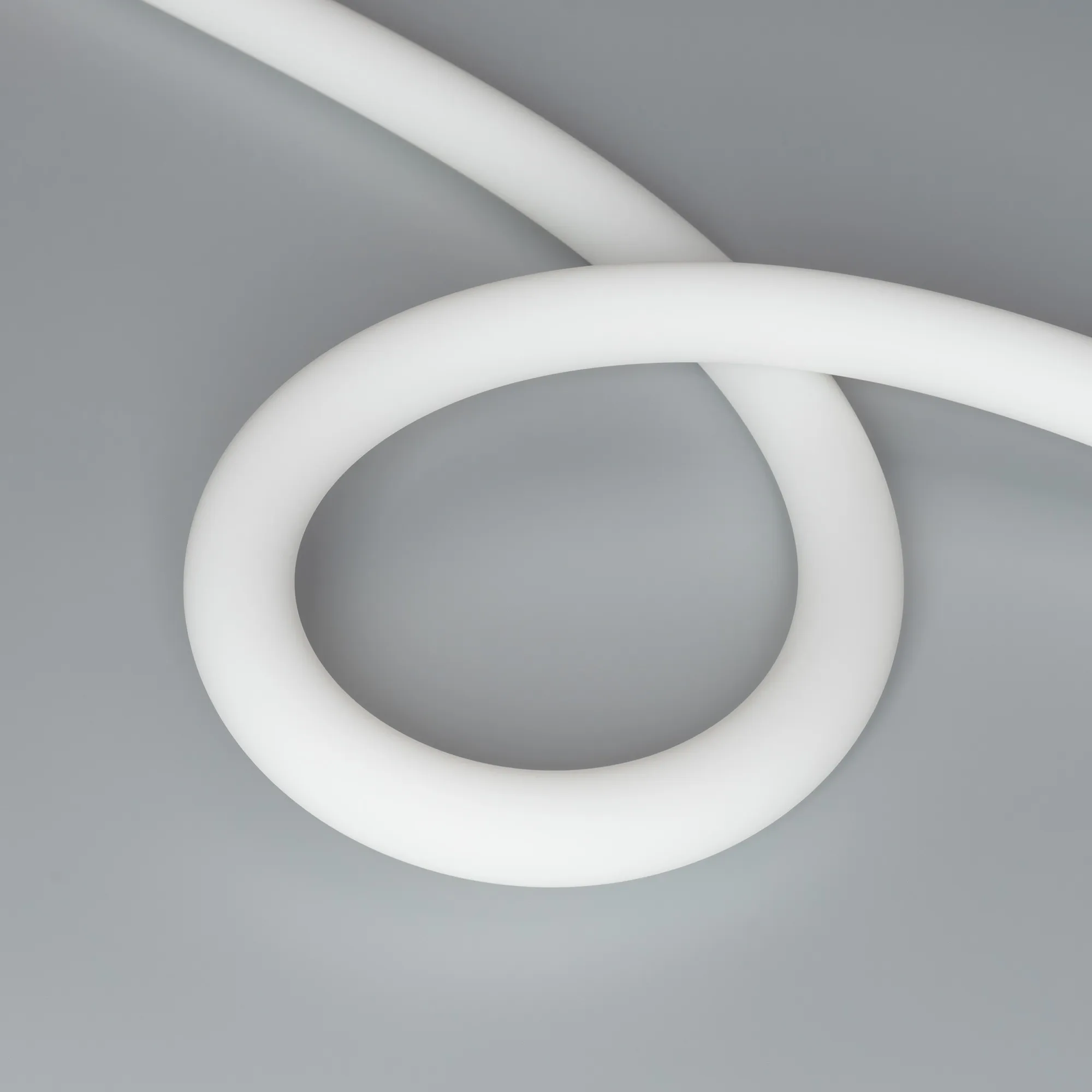 Гибкая герметичная лента (неон серии MOONLIGHT), сечение 25×25 мм. Светодиоды SMD 2835 336 шт/м. Цвет свечения ТЕПЛЫЙ БЕЛЫЙ (3000 К), индекс цветопередачи CRI>90, световой поток 950 лм/м, угол излучения 360°. Мощность 14.4 Вт/м, питание 24 В. Класс пылевлагозащиты IP65. Размеры 5000×25×25 мм. Произвольная резка. Изгиб согласно метки на корпусе, минимальный радиус изгиба 120 мм. Кабель питания длиной 500 мм, вывод с двух сторон перпендикулярно (вбок) линии сечения неона. Катушка 5 м. Цена за 1 м. Гарантия 3 года.
