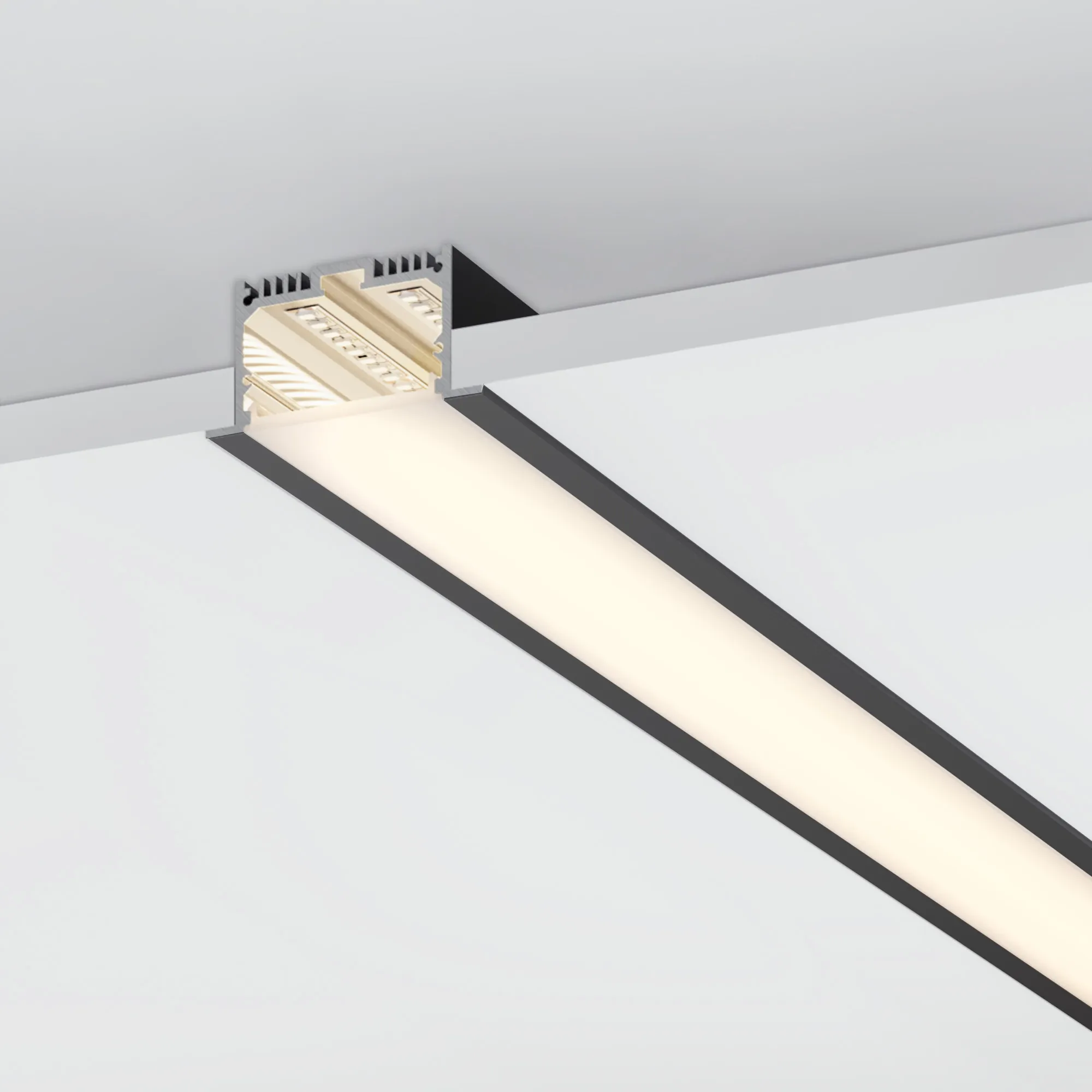 Комплект с экраном. Алюминиевый профиль для светодиодных лент и линеек. Цвет - черный RAL9005 (порошковая окраска). Габаритные размеры (L×W×H): 2500x62x32 мм, паз для установки 49 мм. Ширина площадки для ленты 38 мм. Аксессуары приобретаются отдельно.