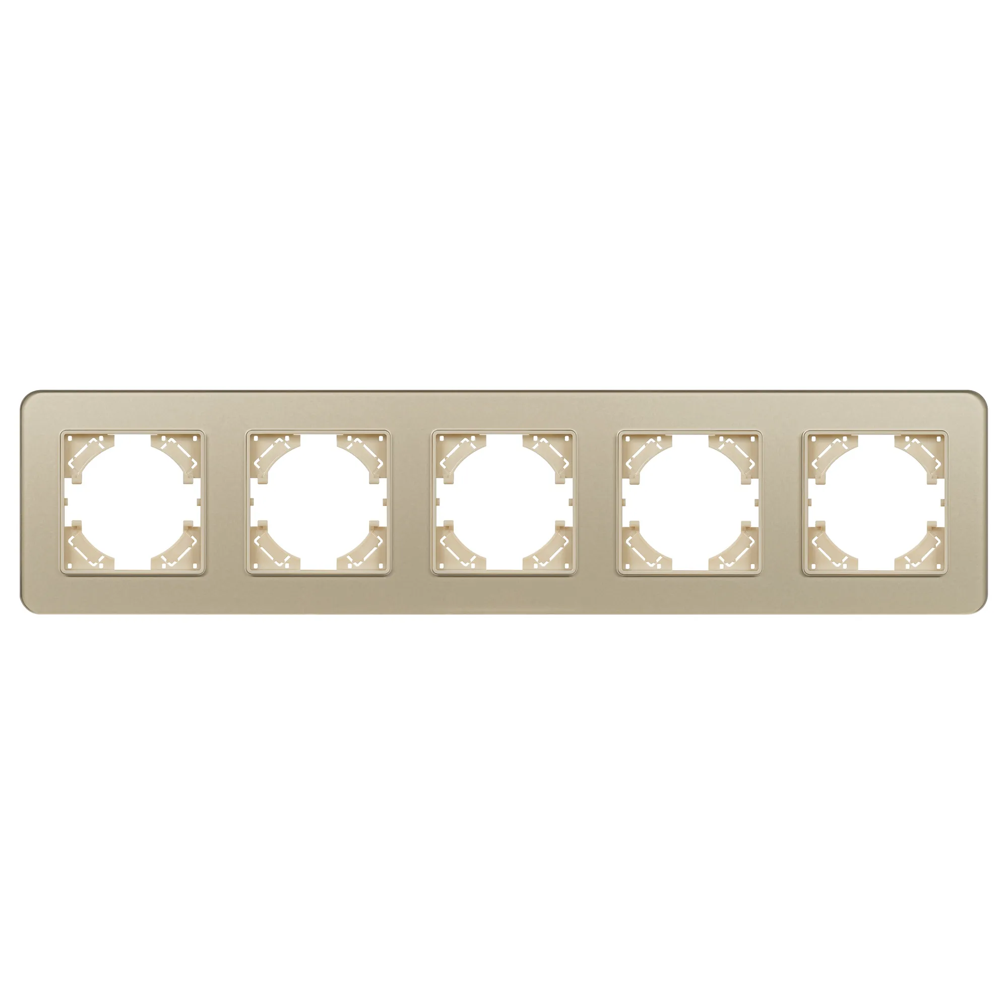 Рамка стеклянная на 5 постов, под встраиваемый механизм. Цвет - золотой с Soft-Touch покрытием. Уровень герметичности IP20. Ориентация монтажа - горизонтальная (основным ориентиром служат посадочные выступы для накладки механизма).