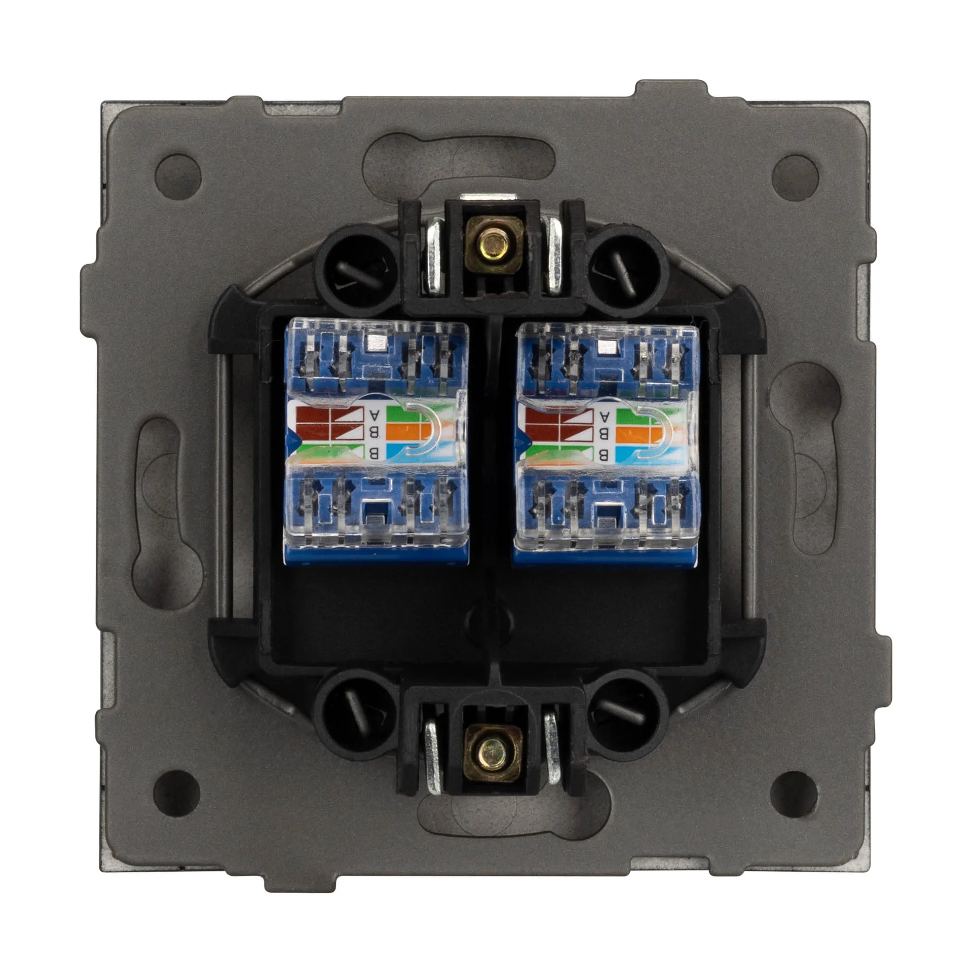 Механизм компьютерной розетки на 2 поста 6-й категории. Цвет - матовый графитовый, с Soft-Touch покрытием. Без фронтальной рамки. Уровень пылевлагозащиты IP20. Розетка устанавливается в стандартный подрозетник круглого сечения диаметром 60мм.
