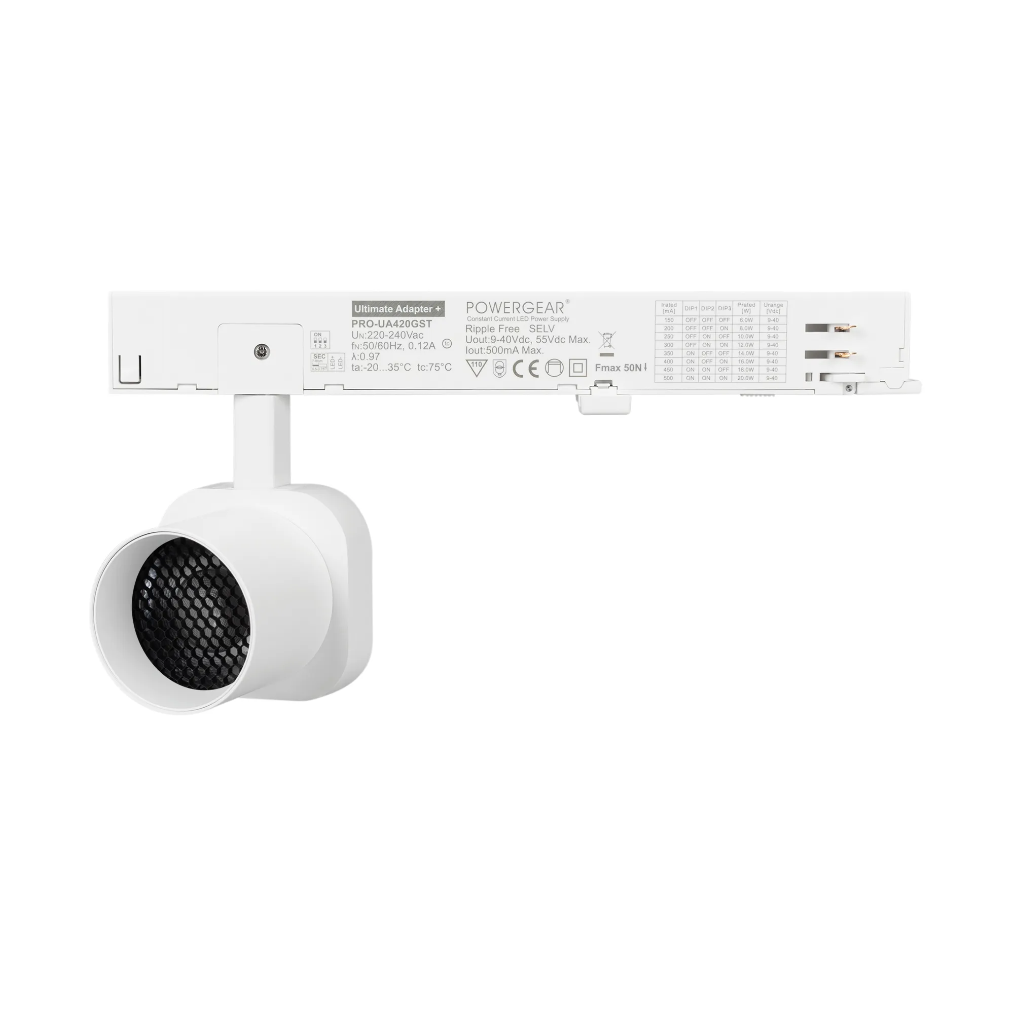 Светильник для треков/шин 4 провода. Мощность 10 Вт, св. поток 650 лм, 65 лм/Вт, дневной 4000 K, CRI>95, угол 20°, напряжение питания 230 В. Решетка HONEYCOMB в комплекте. Белый квадратный корпус из алюминия, материал линзы PC поликарбонат, степень защиты IP20. Размер световой части 60х60х62 мм. Монтаж на трек 3-фазный. Драйвер встроенный 9-40 В, 250мА., пульсация <1%