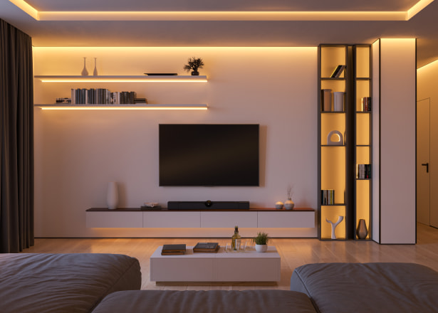 - создать настроение — приглушенные сценарии освещения подходят для расслабленной романтической обстановки, а динамичное освещение (например, с помощью неона) добавляет пространству энергии;
